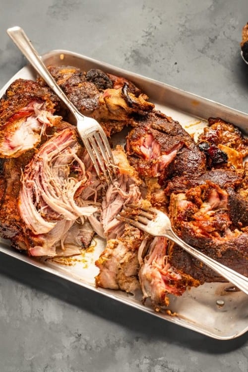 Rub the seasoning mixture all over the pork butt, massaging it into the meat. Cover and refrigerate for at least an hour up to 12 hours.